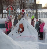 С 25.12.2017 г. по 01.02.2018 года наш детский сад принимал участие в районном конкурсе " Снежные фантазии" Прогулки зимой. Одним из основных факторов оздоровления детей является двигательная активность. Проводимые воспитателями нашего ДОУ оздоровительные мероприятия и применяемые способы организации двигательной активности детей способствуют укреплению их физического и психического здоровья, повышают устойчивость детского организма к ОРЗ, формируют положительное отношение к занятиям физкультурой и спортом. Подвижные игры, упражнения, не только служат для увеличения двигательной активности детей, но и способствуют закреплению навыков основных движений, формируют умение применять накопленный опыт в различных жизненных ситуациях (прыжки, метания снежков и др.). Для того чтобы прогулка в зимнее время проходила интересно, весело, мы с родителями построили снежные фигуры по русским народным сказкам. Эти постройки используем в наших играх. Оборудованный снежными постройками участок несёт главную функцию: всестороннее физическое развитие детей. Постройка для метания в вертикальную и горизонтальную цель, прыжки с «кочки на кочку», «классики», ходьба по снежной дорожке и пр.